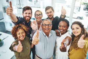 Portrait of a group of businesspeople showing thumbs up in an office